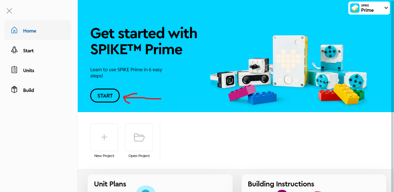 Dnes si projdeme základ s Lego Spike. Když otevřete Spike program a zvolíte si SPIKE Prime, uvidíte na straně menu, jenž obsahuje záložku Start. Dnes si projdeme tyto úlohy.